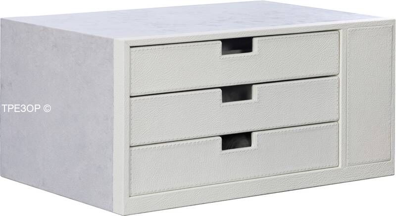 Специальный модуль для хранения ювелирных украшений изготавливается из автомобильной кожи и алькантары выбранных заказчиком оттенков. Представленная модель на 3 ящика адаптирована для установки в сейфы Brixia с ограниченным 90º открыванием двери. Только такая конструкция даёт возможность полностью вытаскивать из сейфа каждый из ящиков, внутренняя начинка которых производится под индивидуальные потребности заказчика, что может влиять на стоимость конкретного изделия. Отсек в "мёртвой" зоне может быть как открытым, так и закрытым, как на фото. Дополнительно приведён пример использования такого модуля в сейфе BRIXIA размера 4 вместе с модулем автоподзавода 4 часовых механизмов и интегрированной подсветкой интерьера. Интерьеры изготавливаются под заказ в течение 4-6 недель в зависимости от выбранных материалов и наполнения ящиков. Высота ящиков и прочие размеры могут быть изменены.
