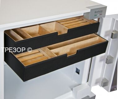 Начинка ящиков выполнена из износоустойчивой замши по эскизу заказчика либо из предложенных вариантов с универсальным заполнением для удобного хранения различных украшений. Размеры ящиков зависят от модели сейфа, а высота от хранимых украшений: все нюансы максимально продуманы и многократно испытаны.