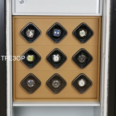 Универсальный модуль на 9 независимых механизмов подзавода часов для сейфов KASO серии E-300 и KEEPs. Это пример индивидуального решения, разработанного и изготовленного по программе bespoke safe. Интерьеры для многих сейфов, в том числе и KASO могут разрабатываться абсолютно индивидуально, а могут собираться из готовых решений или модулей.