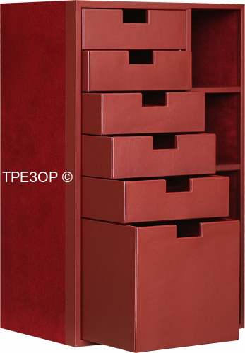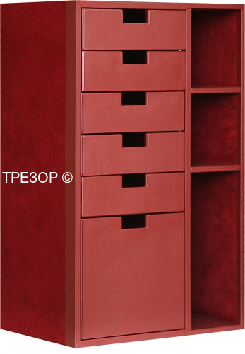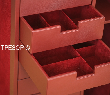 2. Выдвижные ящики с лотками для хранения ювелирных украшений. Каждый лоток с заданной "раскладкой" может быть легко вынут из металлического подвижного каркаса (приобретается отдельно).