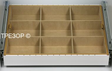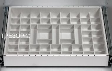 2. Выдвижные ящики с лотками для хранения ювелирных украшений. Каждый лоток с заданной "раскладкой" может быть легко вынут из металлического подвижного каркаса (приобретается отдельно).