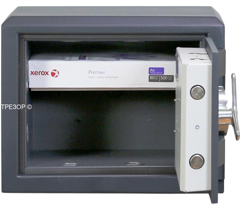 Заводская окраска: снаружи дверь и корпус со всех сторон темно-серый с модным синим оттенком RAL Design 240 30 05 / полка и внутрення панель двери светло-серый RAL 7035. Возможны другие варианты по RAL. Самый маленький сейф в гамме каталонцев всё-таки позволяет разместить внутри себя документы формата А4, но устанавливать его придётся на пол, так как он получился заметно тяжелее своего ближайшего функционального аналога из Италии - сейфа Bordogna Akra 36.