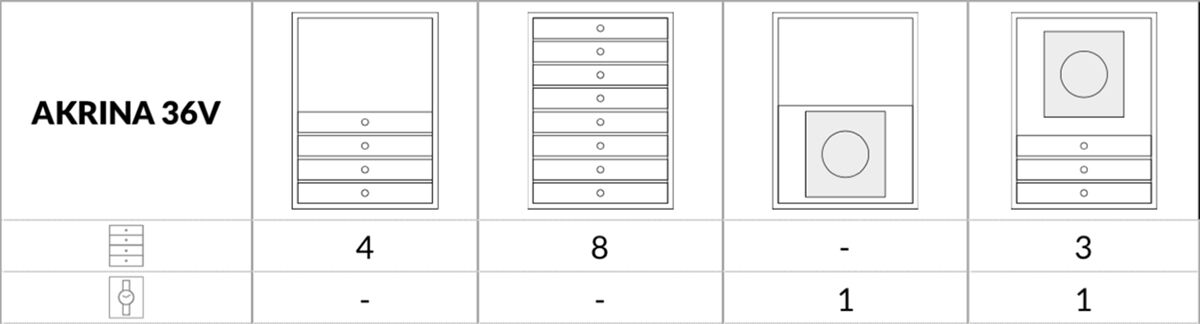Комплектация SE отличается дополнительной внутренней отделкой бежевой замшей и возможностью переставлять полку по высоте. Akra 36 версия 2 получила более развитую ригельную систему с ригелями большего диаметра, другие петли, полку в версии SE и вариант с левосторонним открыванием. Благодаря полной глубине в 38 см (включая петли) умещается внутри любого шкафа. Съёмная дверь облегчает работу по самостоятельной установке. Это идеальный личный (для персонального использования) мебельный сейф.