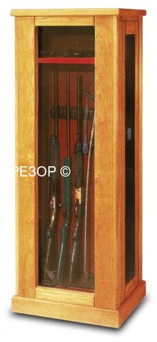 Экстерьер из теплого натурального дерева покрывает прочный оружейный сейф, а за надежным бронированным стеклом любой сможет оценить подсвеченный интерьер из красного бархата. Корпус отделан массивом ценных пород дерева толщиной 20 мм. Модели оснащены 19-ти миллиметровым бронированным стеклом класса A. Уникальная и единственная в своём роде конструкция с дверью, расположенной сбоку! Вмещает 5 длинноствольных ружей.