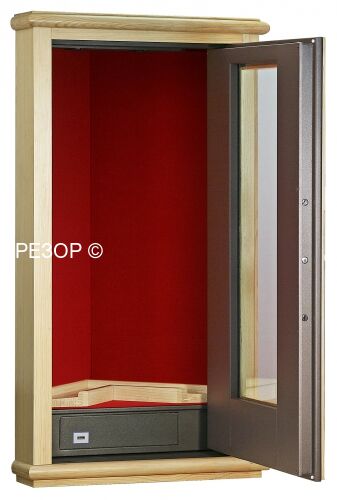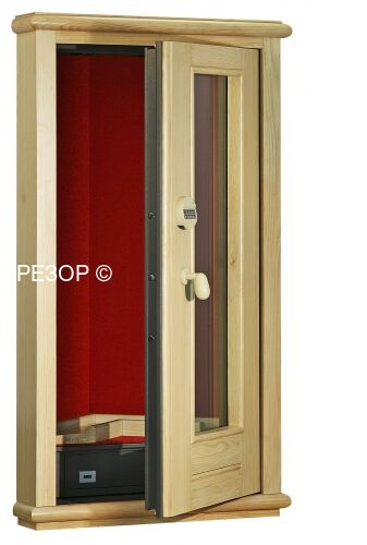 Экстерьер из теплого натурального дерева покрывает прочный оружейный сейф, а за надежным бронированным стеклом любой сможет оценить подсвеченный интерьер из красного бархата. Корпус отделан массивом ценных пород дерева толщиной 20 мм. Модели оснащены 19-ти миллиметровым бронированным стеклом класса A. Данный оружейный сейф представлен в угловом исполнении с электронным замком. Вмещает 8 длинноствольных ружей.