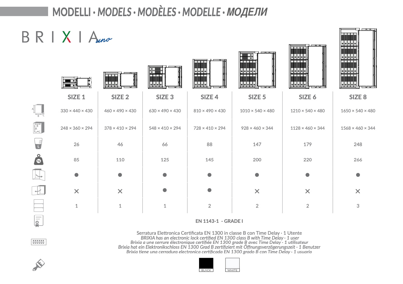 Взломостойкий сейф Brixia 8 самая высокая модель серии Brixia Uno и самый элегантный: отличные пропорции визуально уменьшают габариты, а отсутствие выступающих элементов позволяют установить его в любом месте. Полезный объем позволяет свободно разместить 4 ряда папок типа Корона.