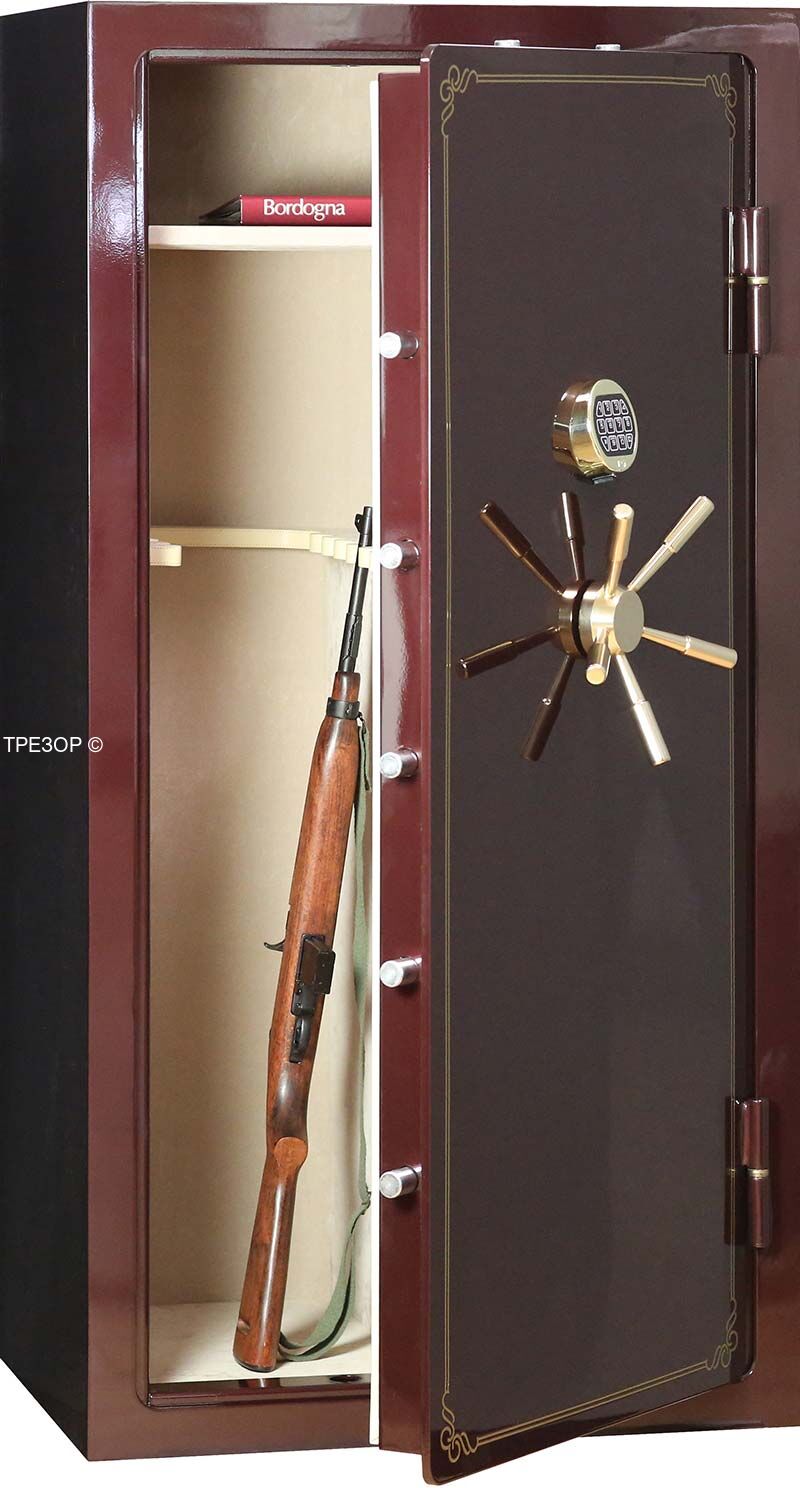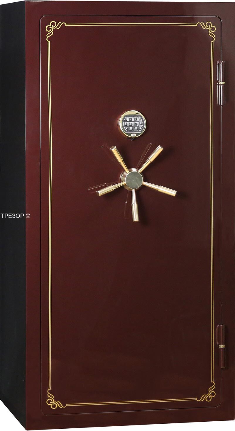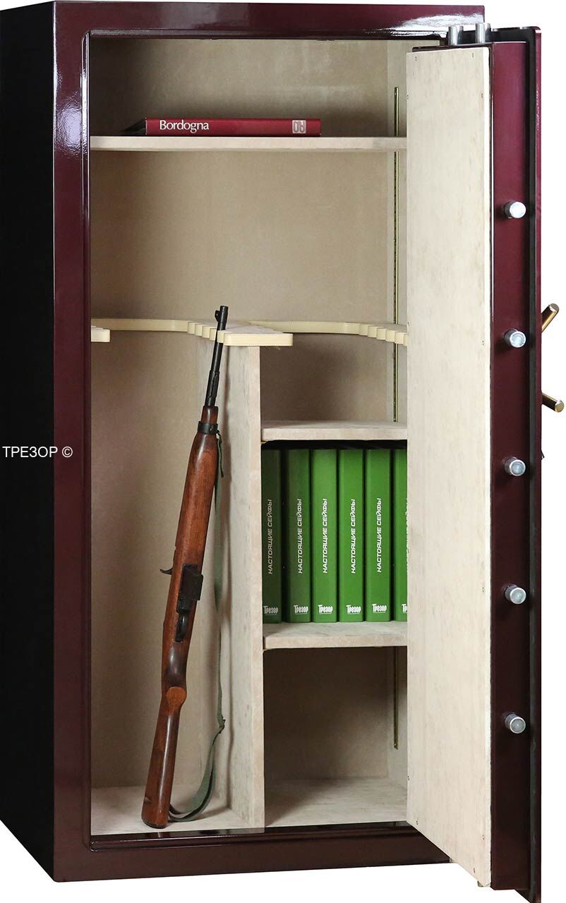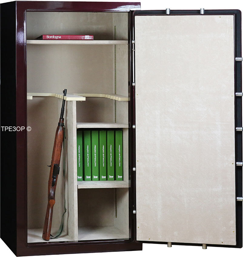 Сейф предназначен для хранения как коллекционного оружия, так и ценностей; отличается прочностью конструкции, внутренней отделкой из искусственной замши цвета шампанского, автоматической системой запирания, штурвалом с золотым покрытием.