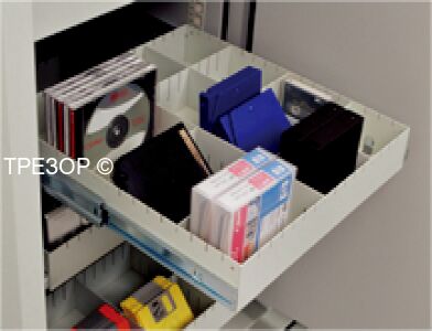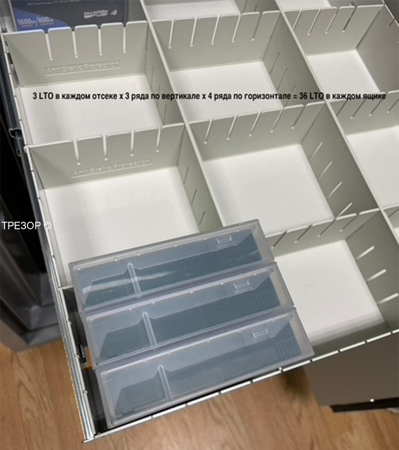 Модель по выбору оснащается универсальными выдвигающимися ящиками или полками. Сейф может быть заказан пустым, без ящиков и полок. Вмещает до 1972 DAT или 940 CD или 627 LTO. Максимальная вместимость составляет 17 универсальных ящиков, заводская базовая комплектация состоит из 2 полок и 5 ящиков. Данная комплектация DTE оптимизирована для хранения лент LTO и включает в себя 12 универсальных ящиков.