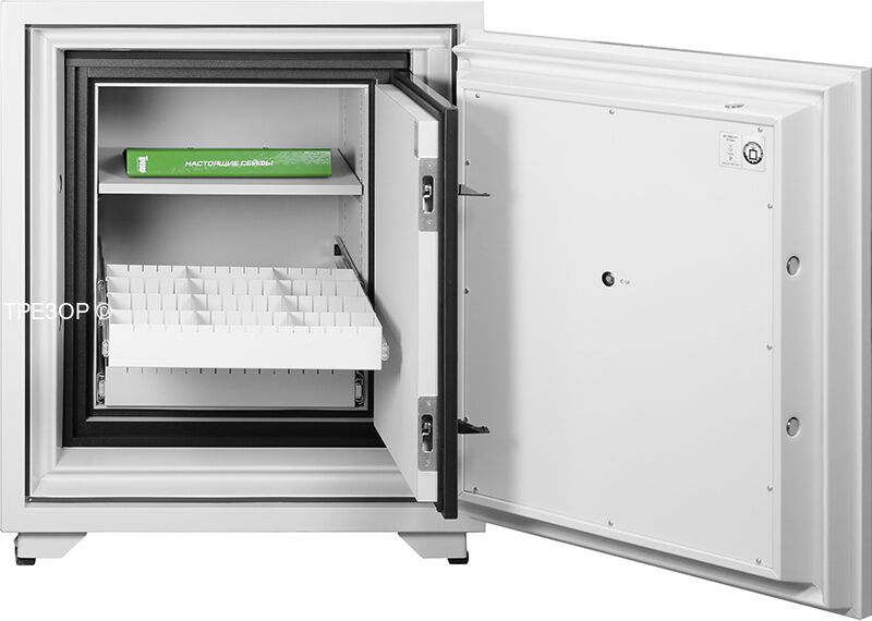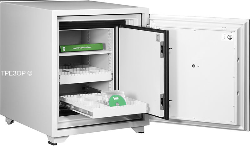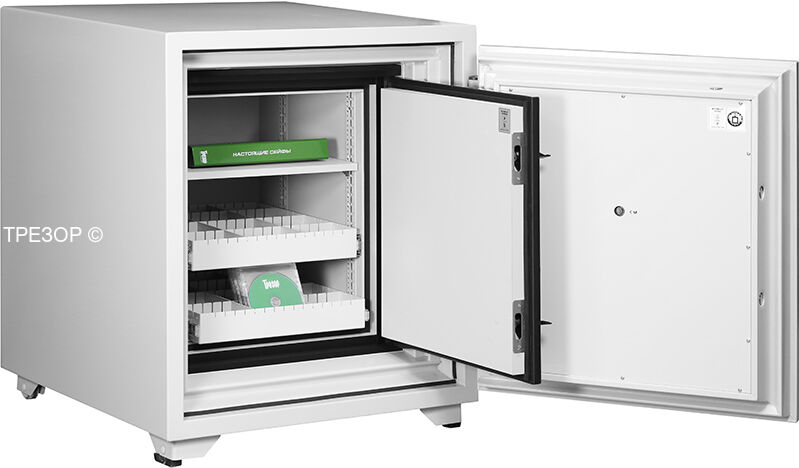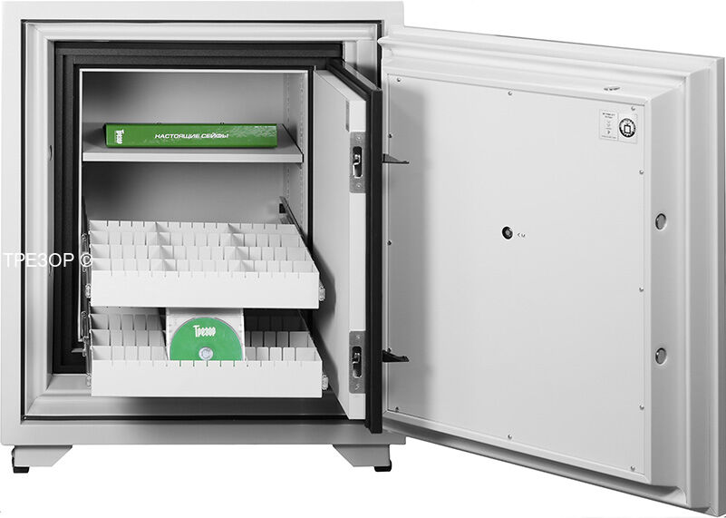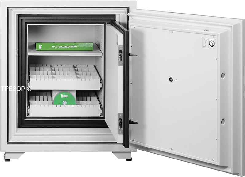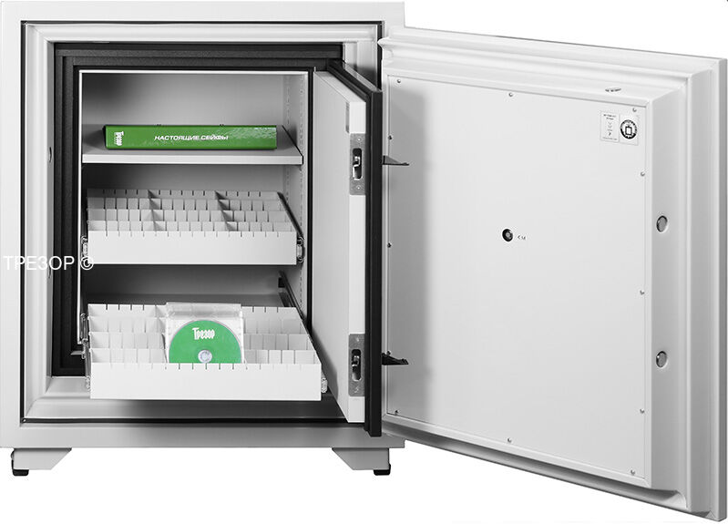 В базовом исполнении модель оснащается 2 универсальными выдвигающимися ящиками и одной полкой. Сейф может быть заказан пустым, без ящиков и полок - индекс этой модификации - DE. Вмещает (по информации производителя) до 580 DAT или 282 CD или 171 LTO. Рекомендуем купить для хранения резервных копий данных с серверов небольшого предприятия. Пустая или с оснащённая только полками версия отлично подойдёт для хранения неформатных информационных материалов типа рентгенограмм или томограмм, фото и кино плёнок.
