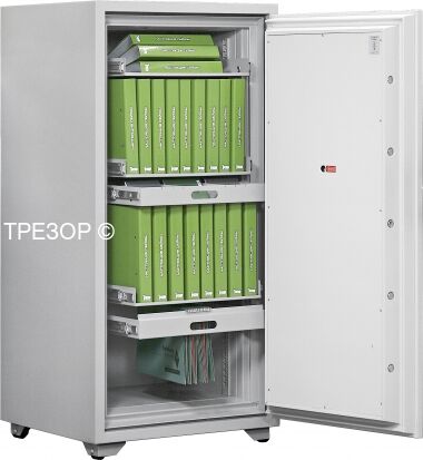 В наличии на складе в Москве остался сейф в последнем экземпляре в следующей комплектации: 3 выдвигаемые полки, 2 файловые выдвигаемые подвески, выдвигаемый ящик с разделителями. Теперь работа с надёжно защищёнными от огня документами станет намного более комфортной. Уже не надо нырять вглубь сейфа за далеко запавшей папкой и метаться от сейфа для папок к сейфу для подвесных файлов, перебегая затем к картотечному сейфу с трудовыми книжками и после кланяться сейфу для магнитных носителей.