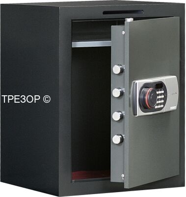 Изготовлен из прочной стали толщиной 6 мм со всех сторон, монолитная стальная дверь толщиной 12 мм запирается активными ригелями диаметром 22 мм. Электронный замок имеет возможность активации второго пользователя, что необходимо для контроля за кассовым персоналом.