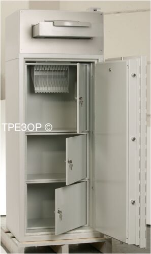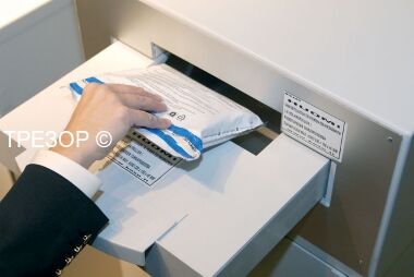 Депозитное решение на базе сейфа KASO PTK E2-330. Сейф сертифицирован на 2-й класс защиты от взлома в соответствии с европейским стандартом CEN 1143-1 (собственно сейф) и CEN 1143-2 (депозитный механизм). Огнестойкость - 60P.