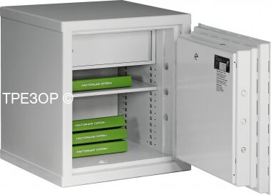 Сейф KASO E3-308 оснащен полками расчитанными на хранение документов в папках A4 (количеством до 8 штук) и запираемым ящиком высотой 150 мм.