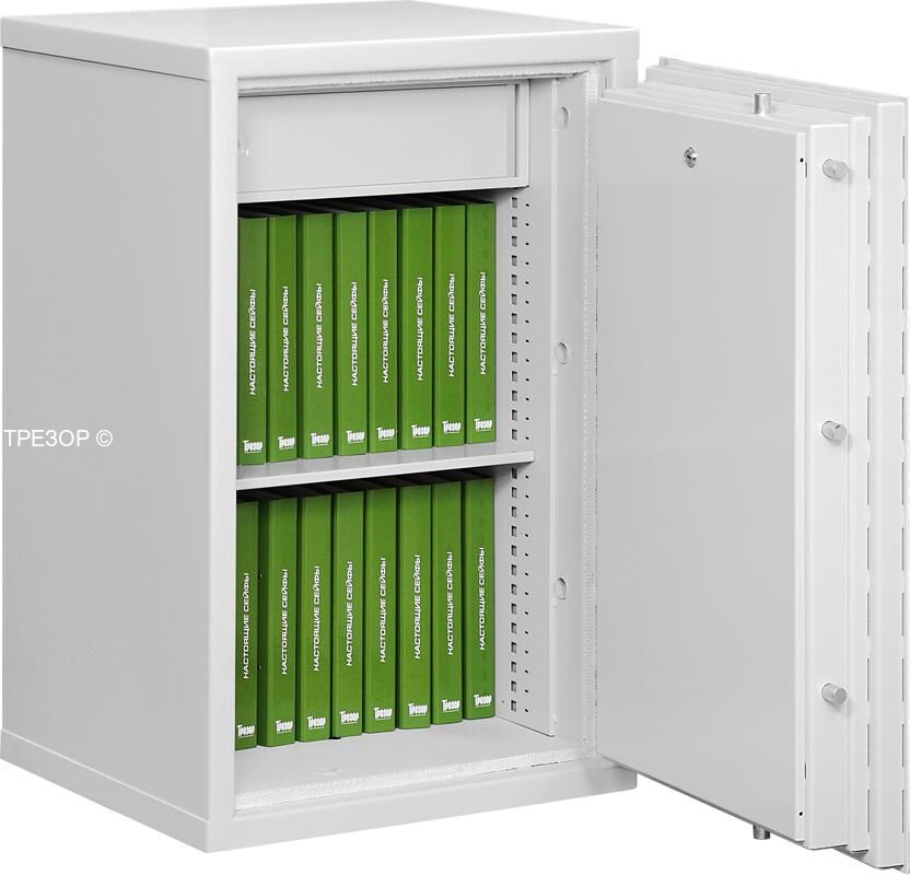 Сейф оснащен полками расчитанными на хранение документов в папках A4 (количеством до 18 штук) и запираемым ящиком высотой 15 см. Возможна установка опций: выдвигающихся лотков для хранения ювелирных украшений, часов, монет и других ценностей.