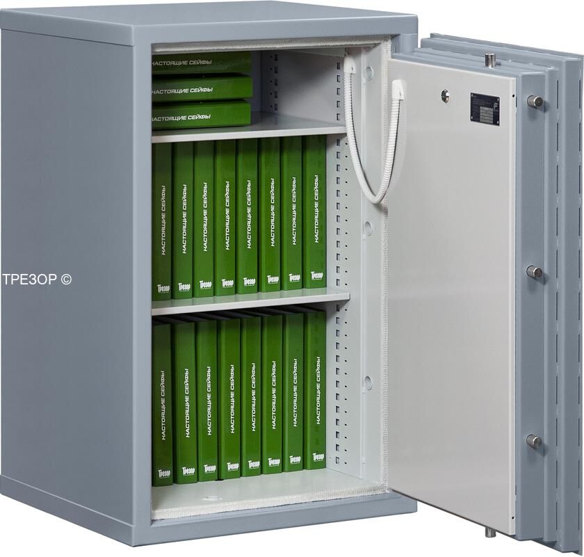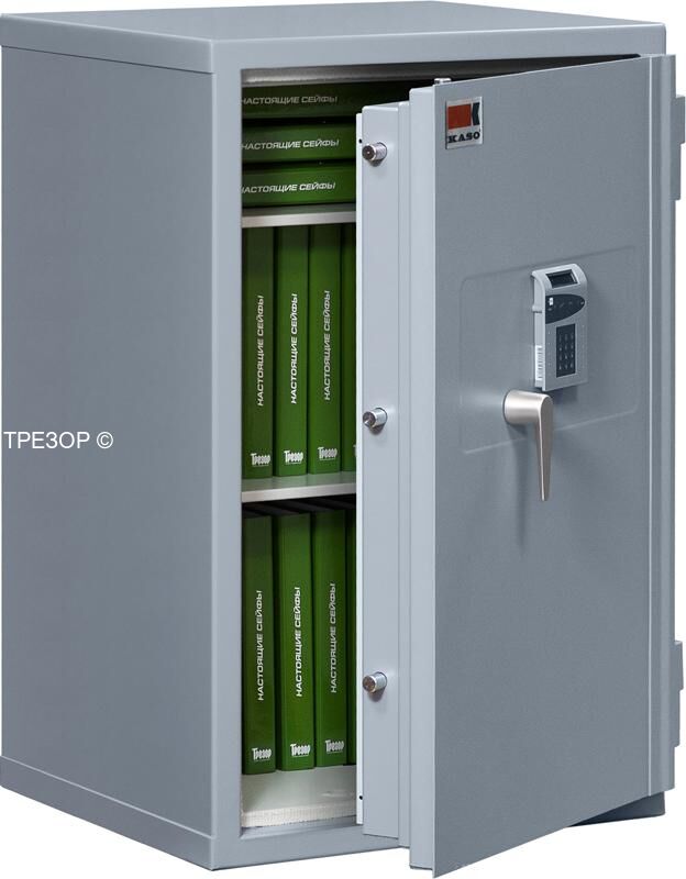 Сейф оснащен полками рассчитанными на хранение документов в папках A4 (количеством до 18 штук) и запираемым ящиком высотой 15 см. Возможна установка опций: выдвигающихся лотков для хранения ювелирных украшений, часов, монет и других ценностей.