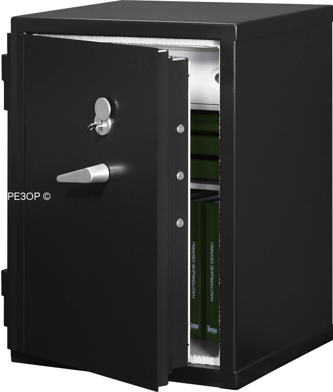 Левосторонний сейф оснащен ключевым перекодируемым замком, одной полкой, рассчитанной на хранение документов в папках A4 (количеством до 16 штук) и запираемым ящиком высотой 150 мм. Данная версия имеет окрашенный в чёрный цвет корпус.