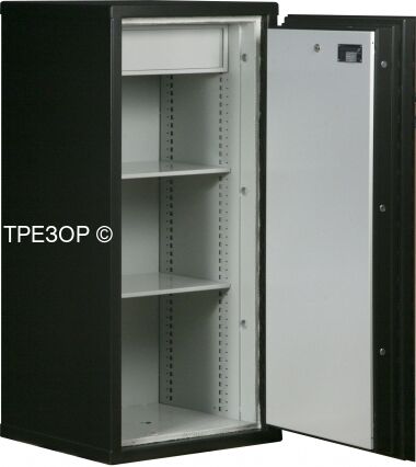 Сейф оснащен полками рассчитанными на хранение документов в папках A4 (количеством до 27 штук) и запираемым ящиком высотой 150 мм.