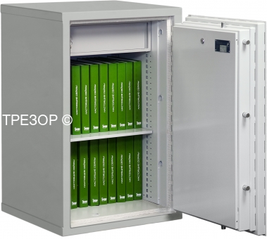 Сейф оснащен полками расчитанными на хранение документов в папках A4 (количеством до 18 штук) и запираемым ящиком высотой 150 мм. Возможна установка опций: выдвигающихся лотков для хранения ювелирных украшений, часов, монет и других ценностей.