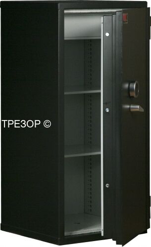 Интерьер сейфа из 2х полок рассчитан на хранение документов в папках A4 (количеством до 27 штук), а сверху установлено запираемое отделение высотой 150 мм. Представлен экземпляр чёрного цвета с электронным замком KASO PTK E3-330BE.