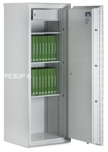 Сейф KASO PTK E3-340E серого цвета с электронным замком оснащен полками расчитанными на хранение документов в папках A4 (количеством до 36 штук) и запираемым ящиком высотой 150 мм. Возможна установка опций: выдвигающихся лотков для хранения ювелирных украшений, часов, монет и других ценностей.