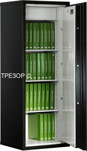 Сейф KASO PTK E3-340B чёрного цвета с ключевым замком оснащен полками расчитанными на хранение документов в папках A4 (количеством до 36 штук) и запираемым ящиком высотой 150 мм. Возможна установка опций: выдвигающихся лотков для хранения ювелирных украшений, часов, монет и других ценностей.
